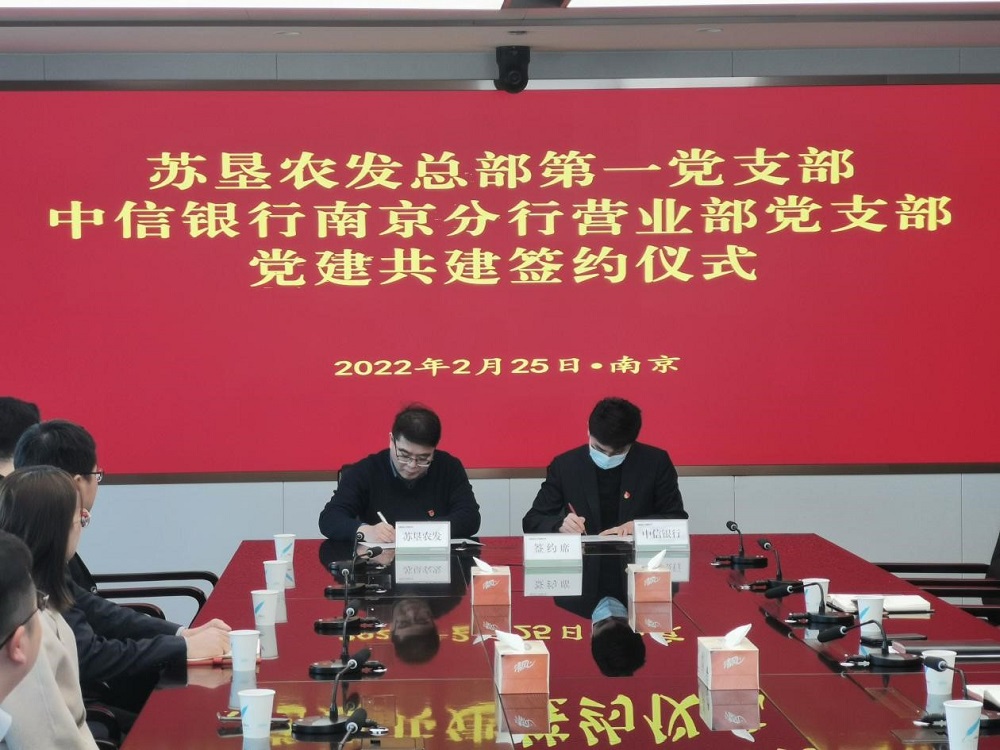 •        2月25日,蘇墾農發(fā)總部第一黨支部與中信銀行南京分行營(yíng)業(yè)部黨支部舉行黨建共建簽約儀式。簽約前,蘇墾農發(fā)總部第一黨支部書(shū)記劉剛和中信銀行南京分行營(yíng)業(yè)部黨支部書(shū)記張磊各自介紹了支部基本情況,并就黨員隊伍建設、黨建工作開(kāi)展以及黨建業(yè)務(wù)融合促進(jìn)等方面內容作交流。隨后,雙方代表簽訂《黨建共建協(xié)議書(shū)》,并互贈黨建書(shū)籍。
