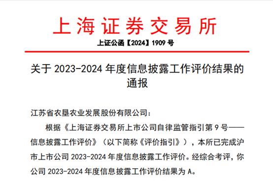 •        近日,上海證券交易所(以下簡(jiǎn)稱(chēng)“上交所”)完成對滬市上市公司2023—2024年度信息披露工作評價(jià),經(jīng)綜合考評,蘇墾農發(fā)(股票代碼:601952)在2023-2024年度上海證券交易所的信息披露工作考核中,獲評最高等級“A”級,上市以來(lái),蘇墾農發(fā)連續5年獲此殊榮。