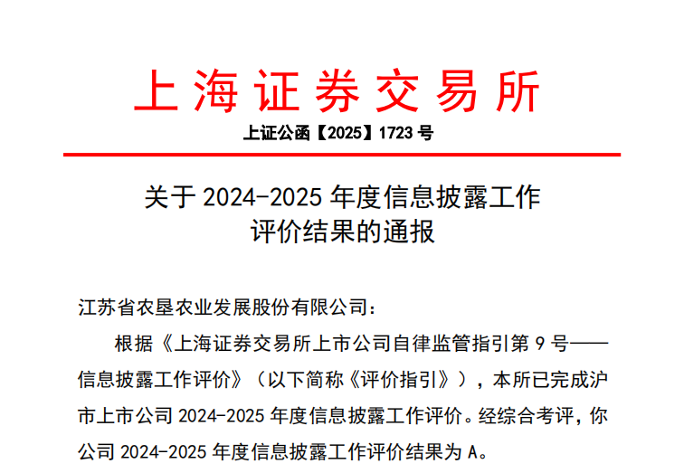 •        近日,上海證券交易所公布滬市主板上市公司2024-2025年度信息披露工作評價(jià)結果,蘇墾農發(fā)(股票代碼:601952)再次獲評最高等級“A”級。至此,公司已連續六年蟬聯(lián)上交所信息披露最高評級。